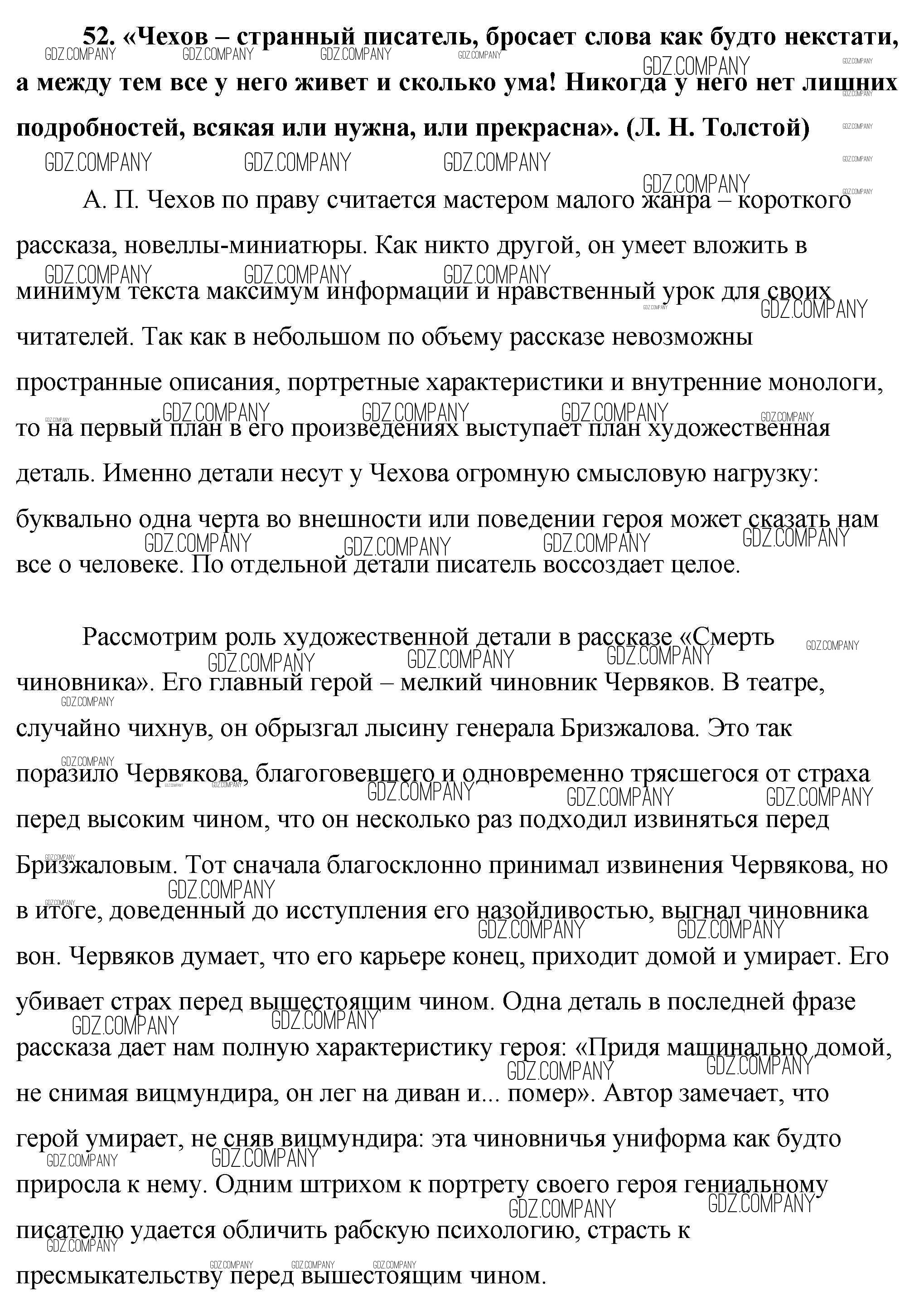 Здесь готовые ответы по Литературе за 10 (десятый) класс от Еременко Сочинения Сам себе репетитор (издательство: ВАКО от 2020 г.) № 52. «Чехов – странный писатель, бросает слова как будто некстати, а между тем все у него живет и сколько ума! Никогда у него нет лишних подробностей, всякая или нужна, или прекрасна». (Л. Н. Толстой)