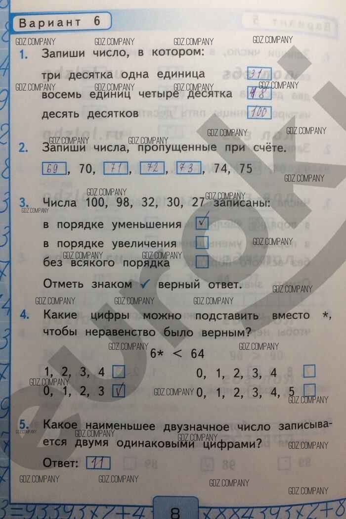 Здесь готовые ответы по Математике за 2 (второй) класс от Рудницкая Контрольные работы УМК (издательство: Экзамен от 2017 г.) № Вар-6