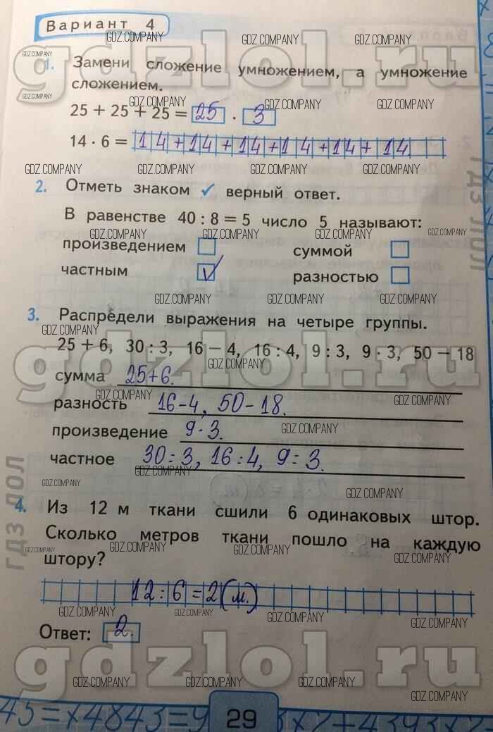 Здесь готовые ответы по Математике за 2 (второй) класс от Рудницкая Контрольные работы УМК (издательство: Экзамен от 2017 г.) № Вар-4