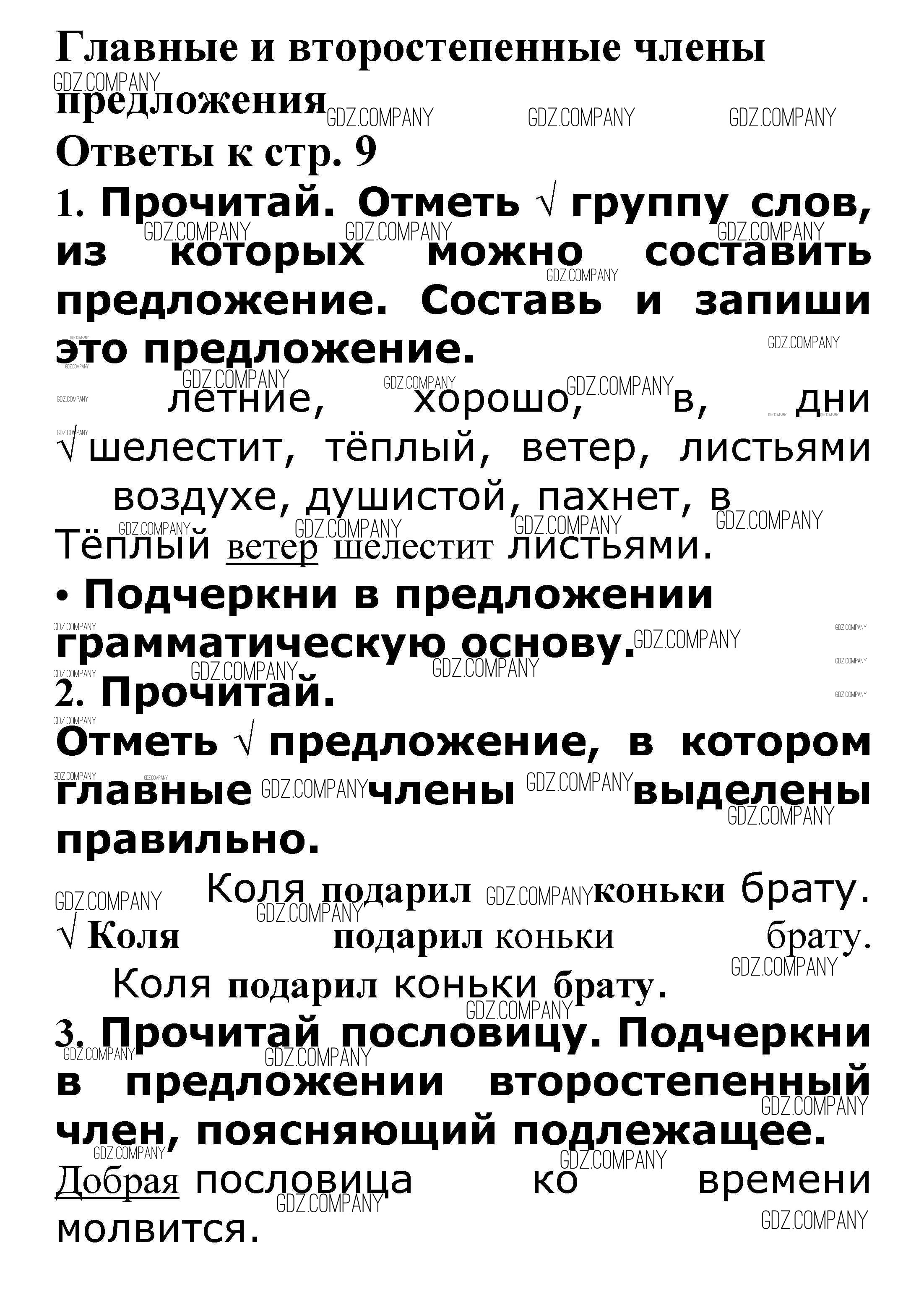 Здесь готовые ответы по Русскому языку за 3 (третий) класс от Канакина, Щеголева Проверочные работы Школа России (издательство: Просвещение от 2018 г.) № Главные и второстепенные члены предложения стр. 9