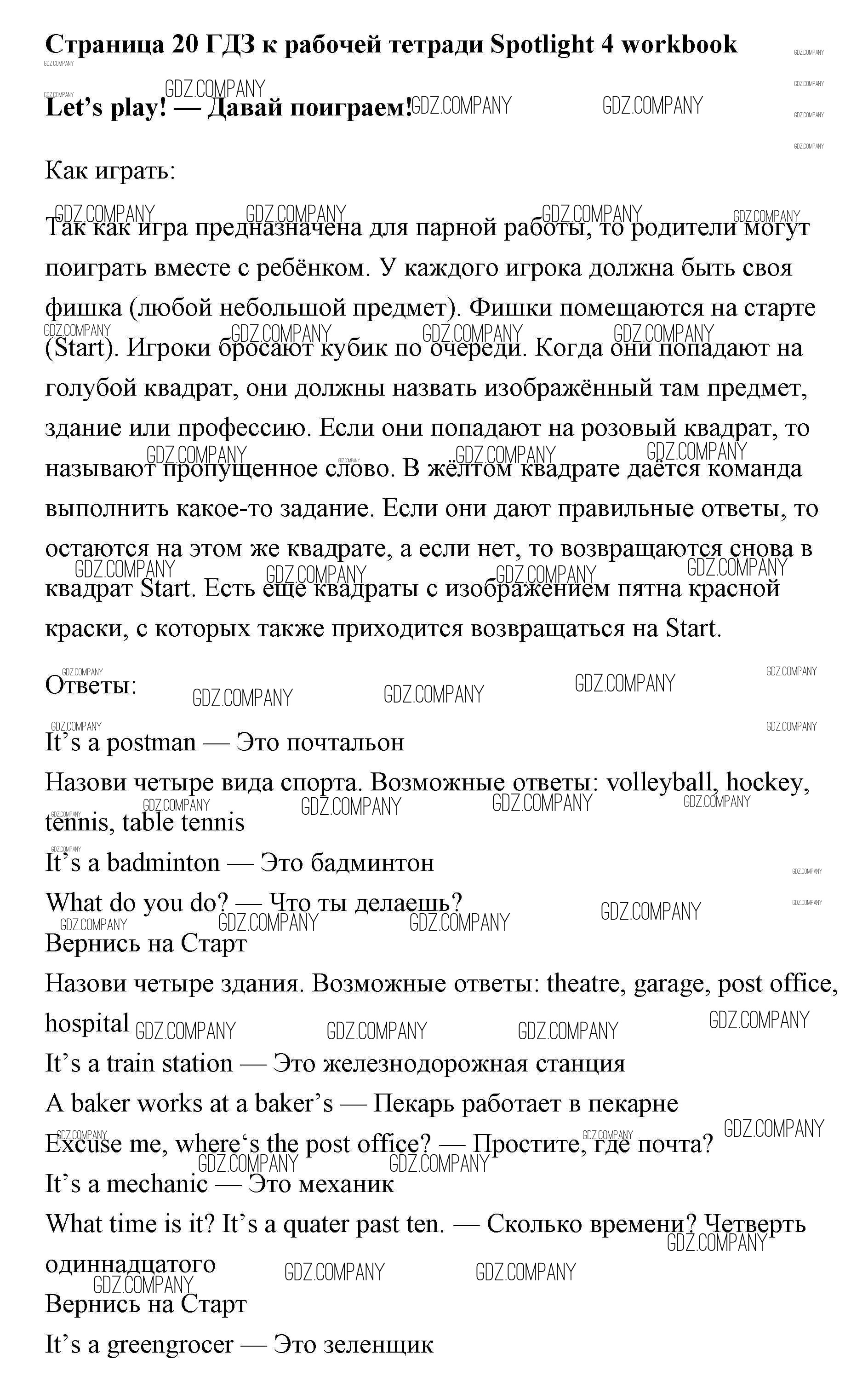 Здесь готовые ответы по Английскому языку за 4 (четвертый) класс от Быкова, Эванс, Дули, Поспелова Рабочая тетрадь Spotlight (издательство: Просвещение от 2017 г.) № страница 20