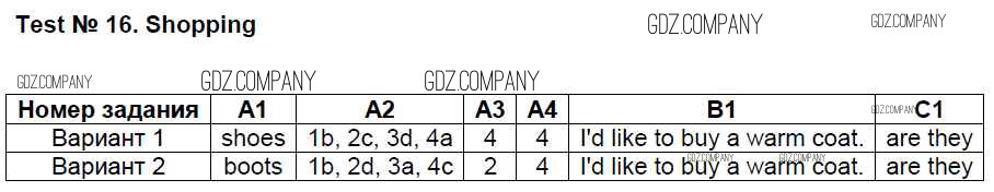 Здесь готовые ответы по Английскому языку за 4 (четвертый) класс от Кулинич Контрольно-измерительные материалы (КИМ) (издательство: ВАКО от 2018 г.) № Тест №16. Shopping