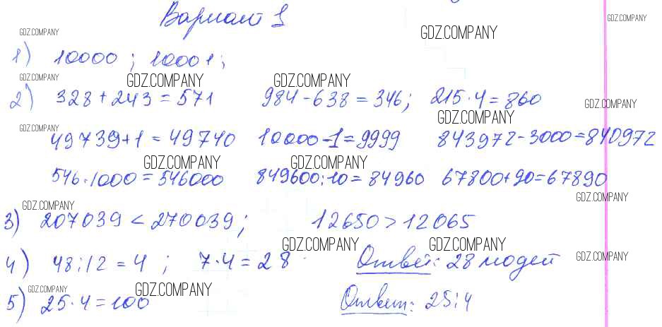 Здесь готовые ответы по Математике за 4 (второй) класс от Волкова Контрольные работы Школа России (издательство: Просвещение от 2017 г.) № Вариант 1