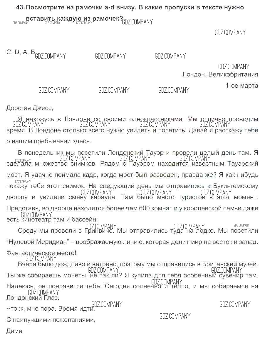 Здесь готовые ответы по Английскому языку за 5 (пятый) класс от Биболетова, Денисенко, Трубанева Учебник Enjoy English (издательство: Титул от 2015 г.) № 43