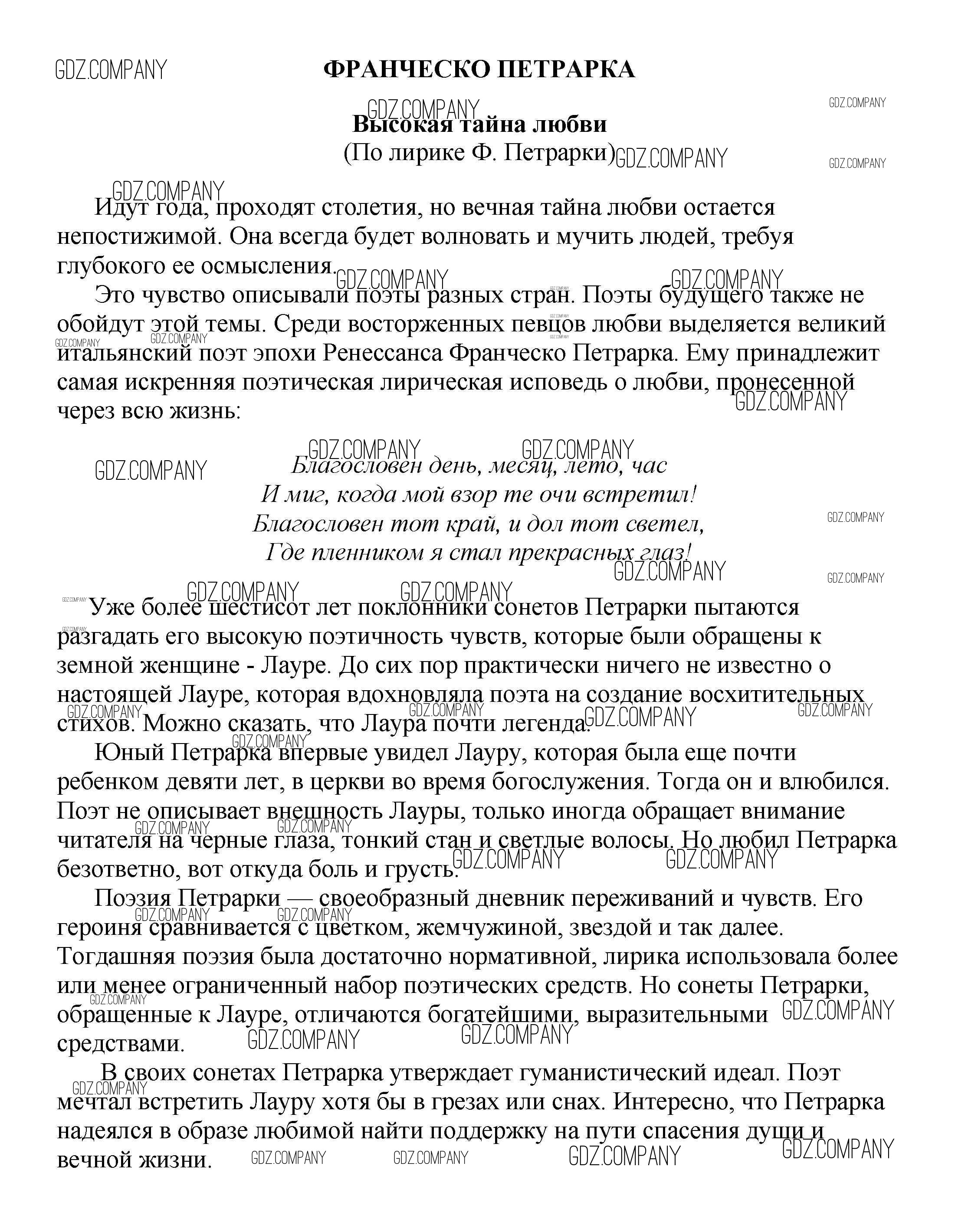 Здесь готовые ответы по Литературе за 5 (пятый) класс от Белик, Музычук Сочинения (издательство: Баро-Пресс от 2017 г.) № Высокая тайна любви (По лирике Ф. Петрарки
