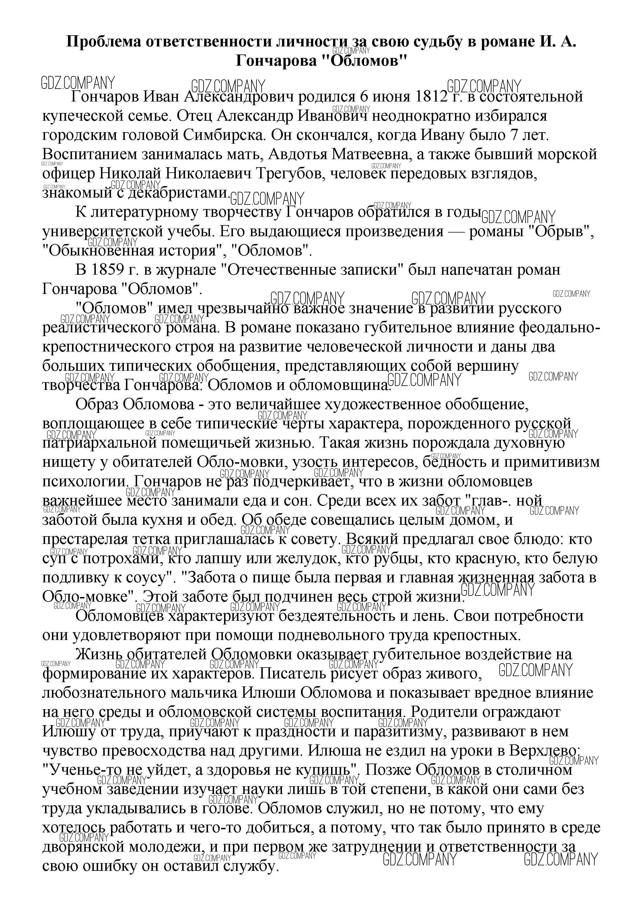 10 класс / сочинения по русской литературе / Проблема ответственности личности за свою судьбу в романе И. А. Гончарова "Обломов"
