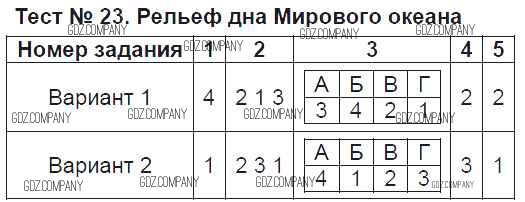 Здесь готовые ответы по Географии за 6 (шестой) класс от Пятунина, Пятунин Тесты УМК (издательство: Экзамен от 2017 г.) № Тест-23. Рельеф дна Мирового океана