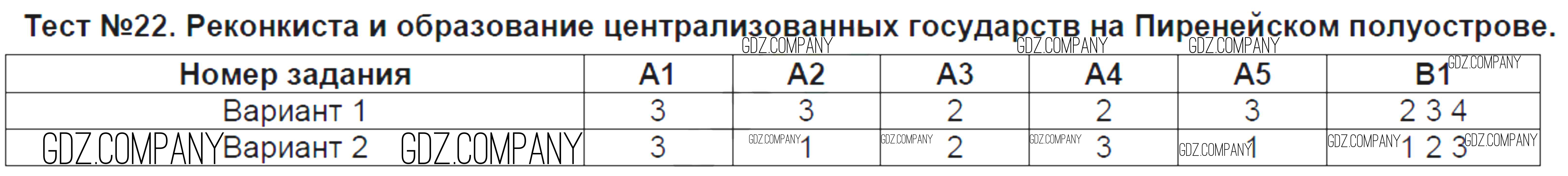 Здесь готовые ответы по Истории за 6 (шестой) класс от Чернова Контрольно-измерительные материалы (КИМ) (издательство: Экзамен от 2015 г.) № Тест №22. Реконкиста и образование централизованных государств на Пиренейском полуострове