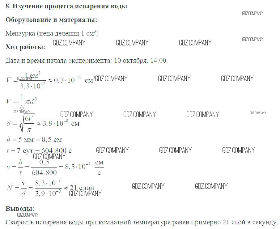 Здесь готовые ответы по Физике за 7 (седьмой) класс от Белага, Воронцова, Жумаев, Ломаченков, Панебратцев Тетрадь-практикум Сферы (издательство: Просвещение от 2012 г.) № №8. Изучение процесса испарения воды