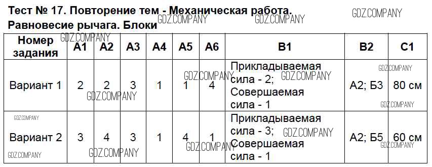 Здесь готовые ответы по Физике за 7 (седьмой) класс от Бобошина Контрольно-измерительные материалы (КИМ) (издательство: Экзамен от 2014 г.) № Тест №17. Повторение тем - Механическая работа. Равновесие рычага. Блоки