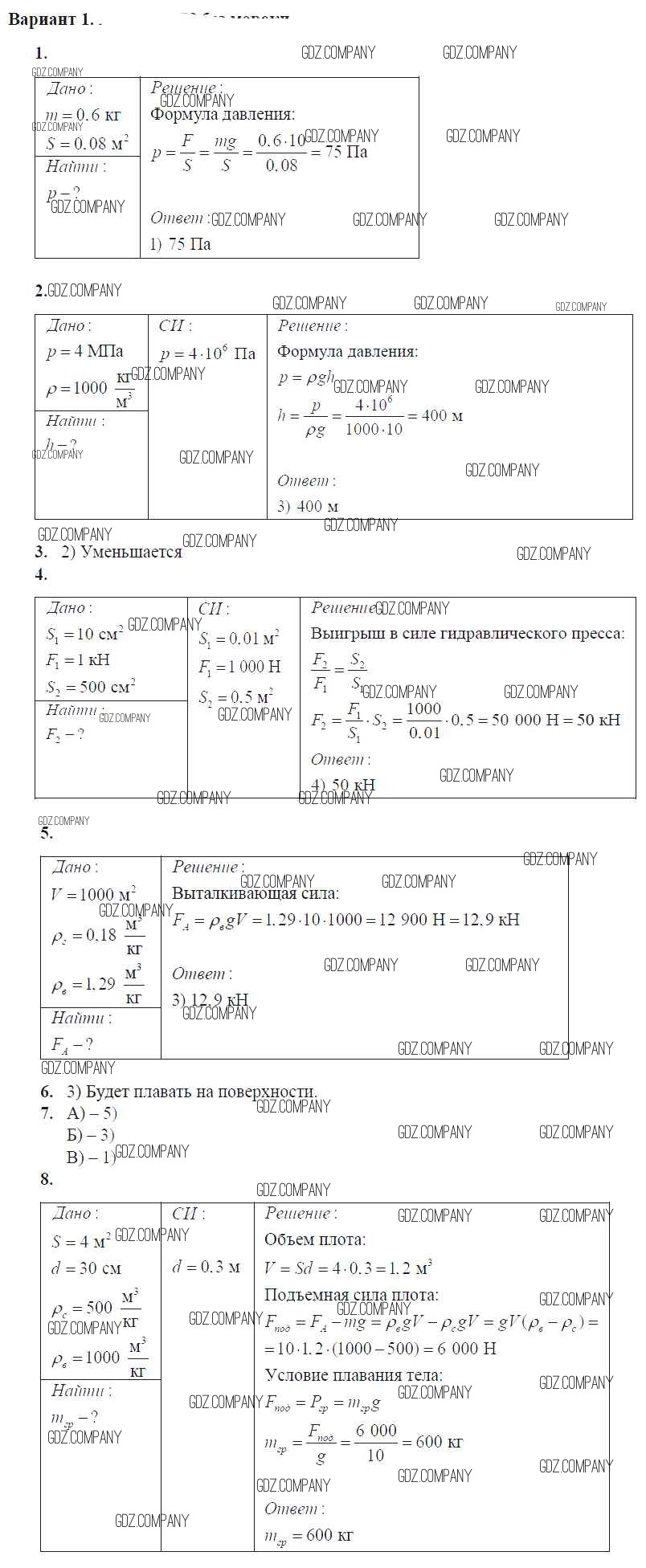 контрольная работа / глава 3. давление твердых тел, жидкостей и газов / вар. 1