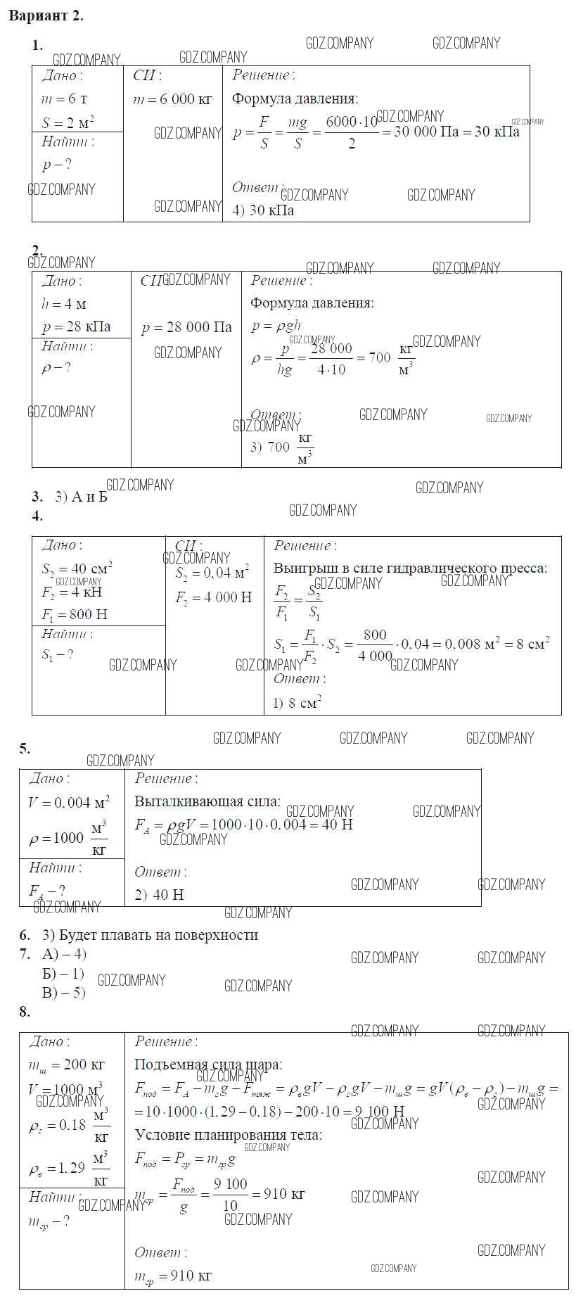 контрольная работа / глава 3. давление твердых тел, жидкостей и газов / вар. 2