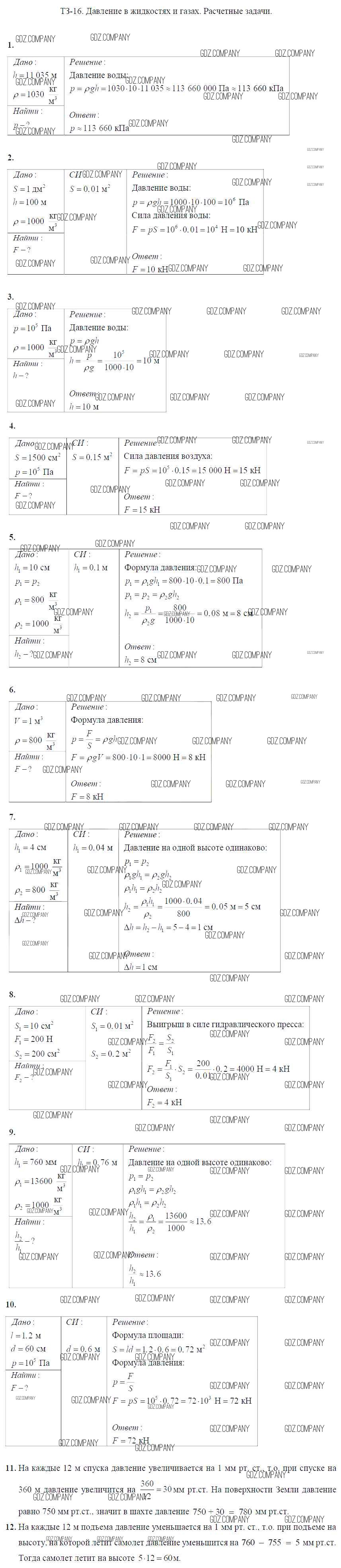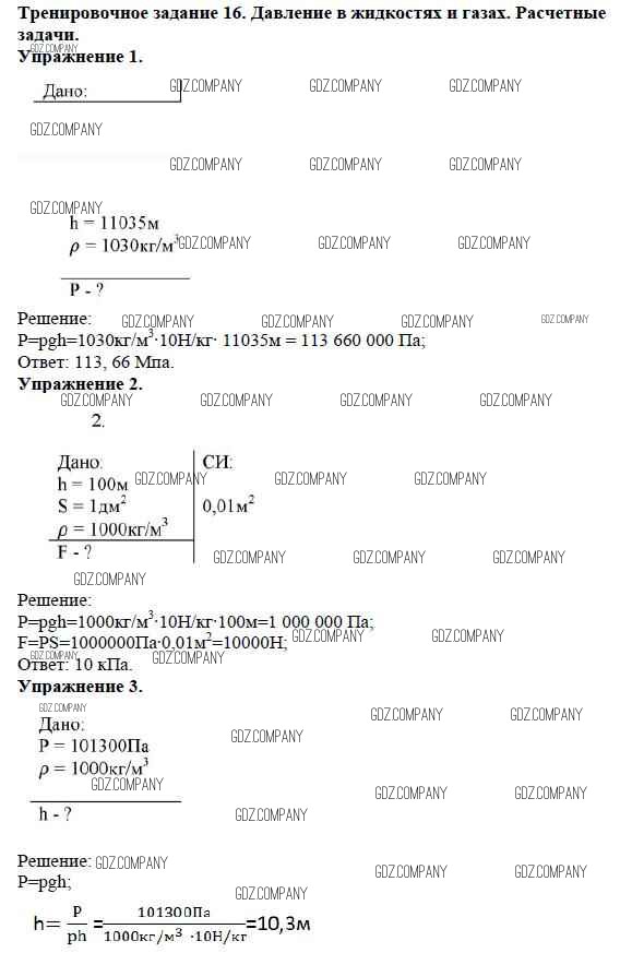 Здесь готовые ответы по Физике за 7 (седьмой) класс от Марон Дидактические материалы Вертикаль (издательство: Дрофа от 2019 г.) № Задание №16. Давление в жидкостях и газах. Расчетные задачи