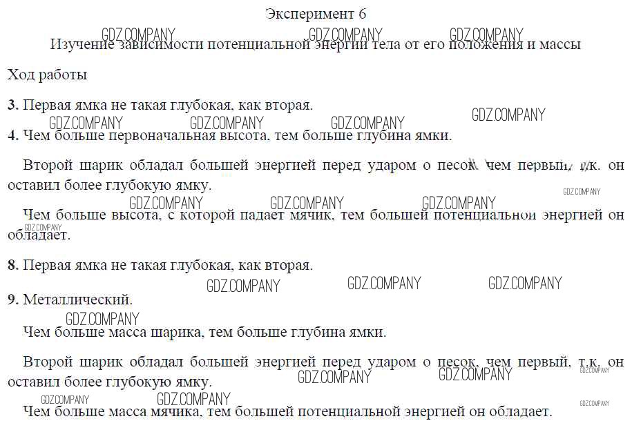 Здесь готовые ответы по Физике за 7 (седьмой) класс от Минькова, Иванова Тетрадь для лабораторных работ УМК (издательство: Экзамен от 2017 г.) № Эксперимент 6. Изучение зависимости потенциальной энергии тела от его положения и массы
