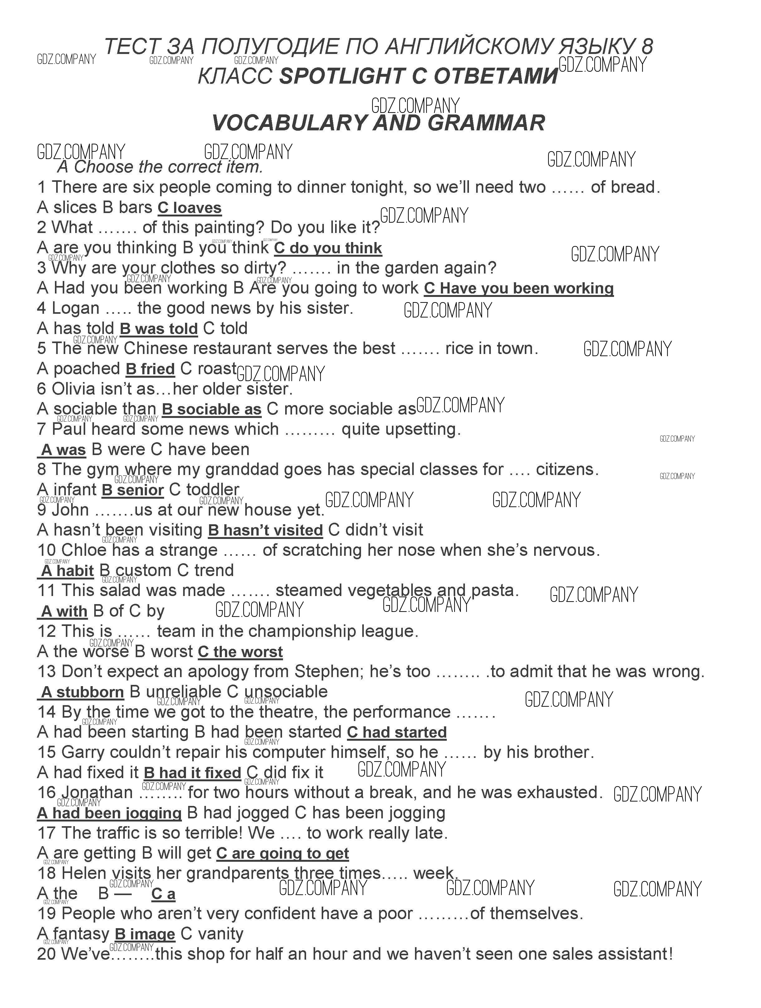 Здесь готовые ответы по Английскому языку за 8 (восьмой) класс от Ваулина, Дули, Подоляко, Эванс Контрольные задания Spotlight (издательство: Просвещение от 2018 г.) № A