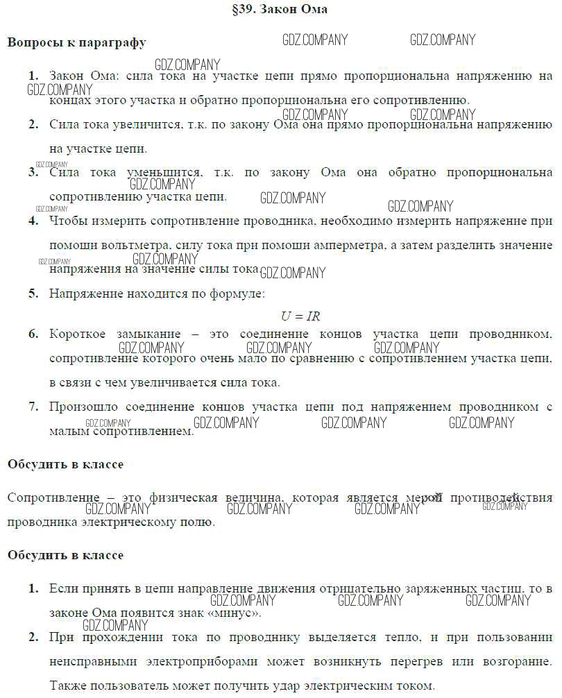 Здесь готовые ответы по Физике за 8 (восьмой) класс от Громов, Родина, Белага Учебник (издательство: Просвещение от 2018 г.) № § 39. Закон Ома