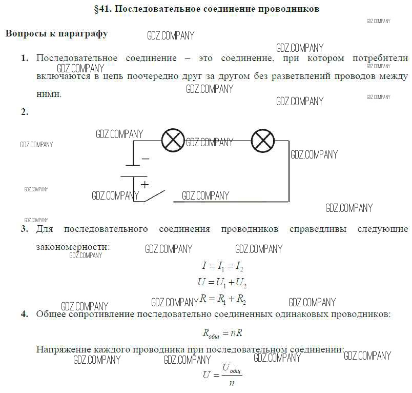 Здесь готовые ответы по Физике за 8 (восьмой) класс от Громов, Родина, Белага Учебник (издательство: Просвещение от 2018 г.) № § 41. Последовательное соединение проводников