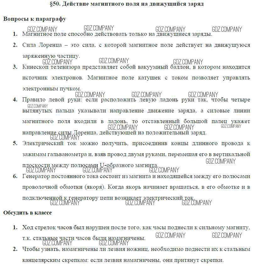 Здесь готовые ответы по Физике за 8 (восьмой) класс от Громов, Родина, Белага Учебник (издательство: Просвещение от 2018 г.) № § 50. Действие магнитного поля на движущийся заряд