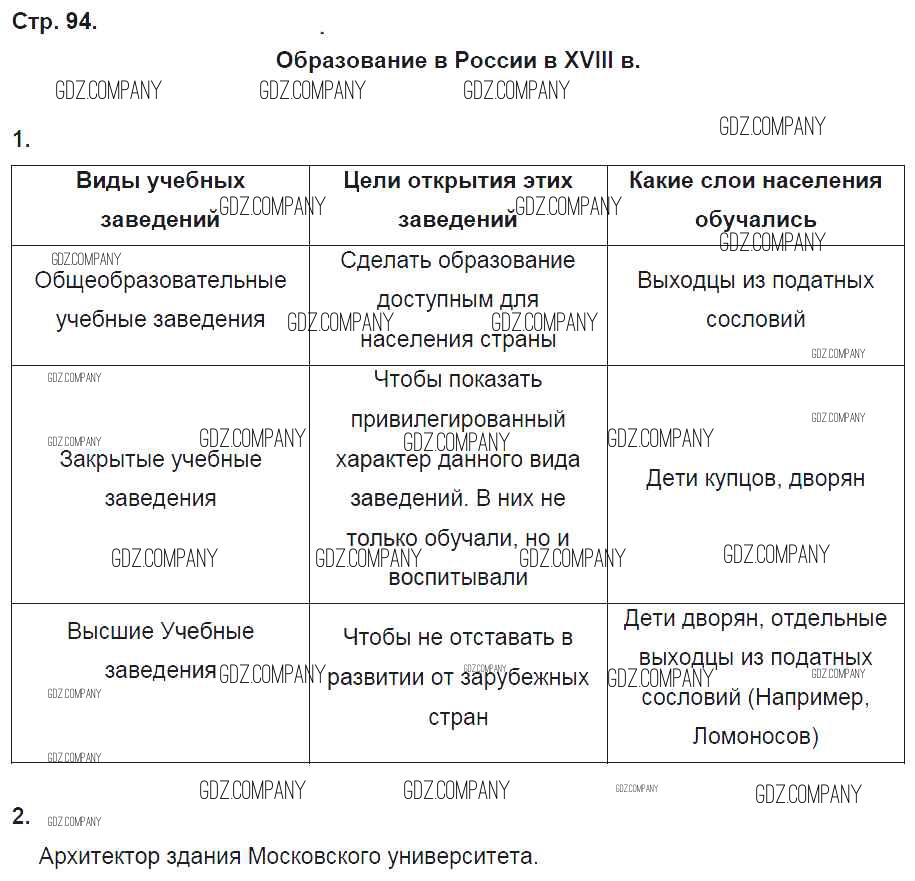 Здесь готовые ответы по Истории за 8 (восьмой) класс от Артасов, Данилов, Косулина, Соколова Рабочая тетрадь УМК (издательство: Просвещение от 2016 г.) № 94