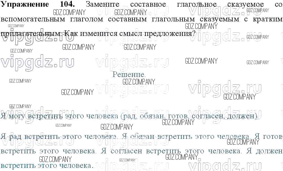 Здесь готовые ответы по Русскому языку за 8 (восьмой) класс от Тростенцова, Ладыженская, Дейкина, Александрова Учебник (издательство: Просвещение от 2014 г.) № 104