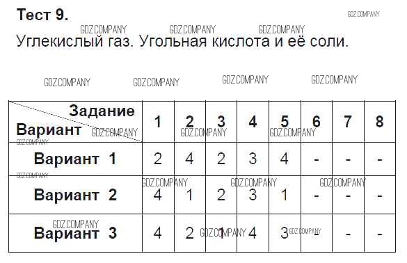 Здесь готовые ответы по Химии за 9 (девятый) класс от Боровских Тесты УМК (издательство: Экзамен от 2013 г.) № Тест-9. Углекислый газ. Угольная кислота и её соли